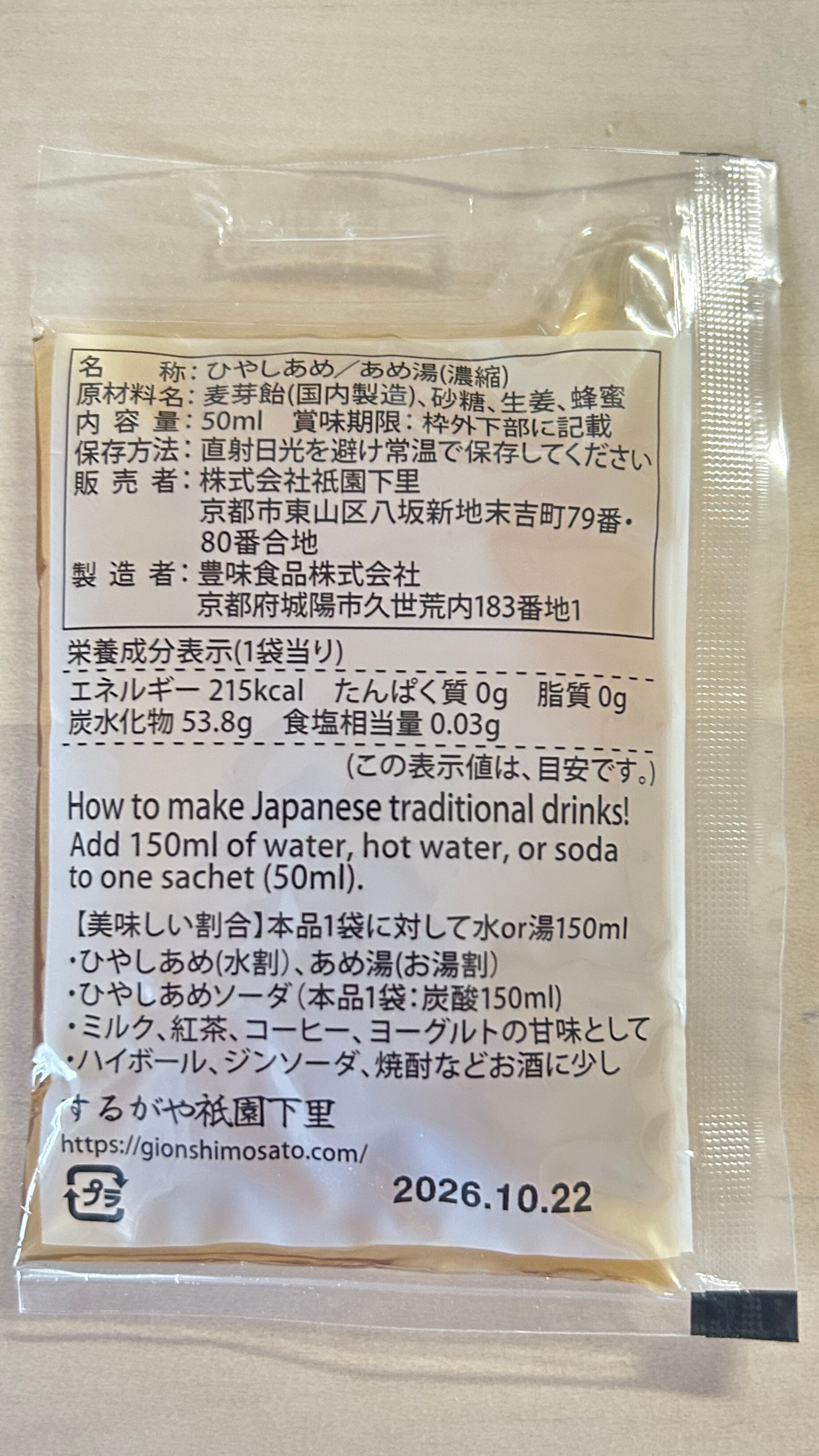 ひやしあめ1袋(50g)に、水150mlで薄めると、より美味しく飲みやすくなります